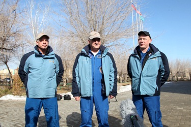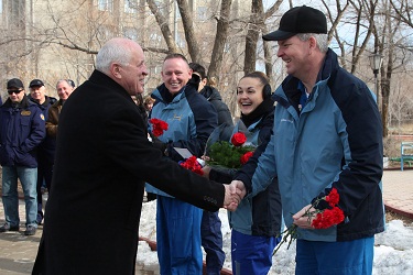 Анатолий Петренко вручил космонавту Елене Серовой и астронавту НАСА Барри Уилмору серебряные памятные знаки «Байконур» в знак посещения космической гавани. Александр Самокутяев уже имеет в своем багаже один космический полет и не раз бывал на Байконуре. Дублеры возложили цветы к памятнику Юрию Гагарину и сфотографировались у монумента.