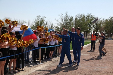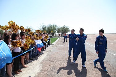 Из аэропорта космонавты и астронавты проследовали в город. На сегодня намечена первая тренировка экипажей на 254 площадке космодрома. В субботу в испытательном учебно-тренировочного комплекса ЦПК будут подняты флаги государств – участников космического полета.