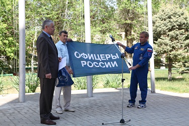 На церемонию поднятия флагов были приглашены представители Регионального представительства Общероссийской общественной организации «Офицеры России» на комплексе «Байконур». Командир экипажа Максим Сураев передал руководителю байконурского филиала организации Петру Майданову флаг «Офицеры России», который побывал в космосе и был возвращен на Землю Михаилом Тюриным.
