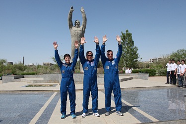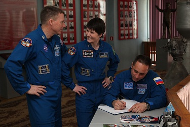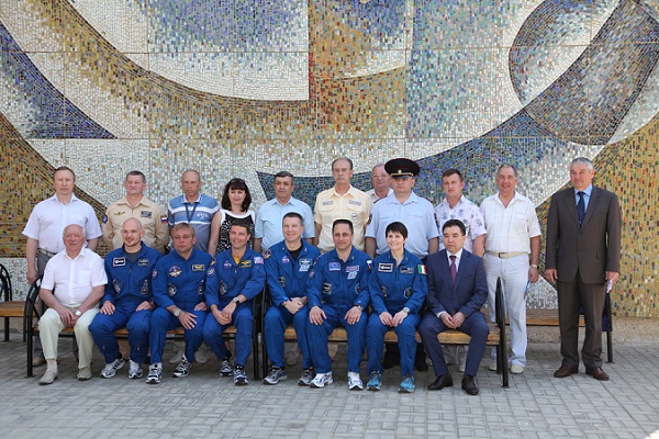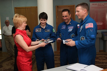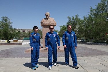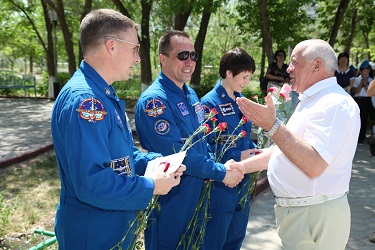 Анатолий Петренко вручил астронавтам Саманте Кристофоретти и Терри Вёртс серебряные памятные знаки «Байконур» в знак посещения космической гавани. Антон Шкаплеров уже имеет в своем багаже один космический полет и не раз бывал на Байконуре. Дублеры возложили цветы к памятнику Юрию Гагарину и сфотографировались у монумента. Учащиеся международной космической школы запустили для гостей модели ракет, изготовленные своими руками.
