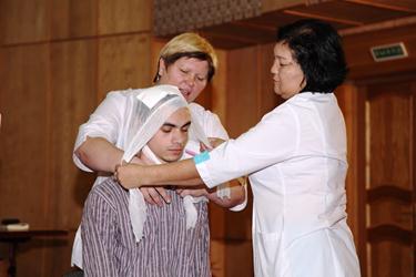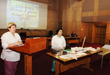 Во исполнение постановления Главы администрации города Байконур от 1 сентября 2014 г. № 180 "О подготовке населения города Байконур в области защиты от чрезвычайных ситуаций", 15 октября в городской администрации состоялось занятие для сотрудников Аппарата Главы и других подразделений городской администрации по теме «Первая помощь при тепловом и солнечном ударах, обморожениях, переломах, ушибах, вывихах и ожогах». Занятие проводили квалифицированные специалисты Государственного бюджетного профессионального образовательного учреждения «Байконурский медицинский техникум» Татьяна Азимова и Жанар Мурзабекова.