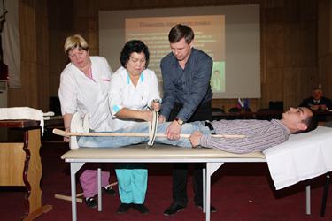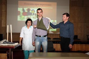 В ходе занятия медицинские работники рассказали присутствующим о способах оказания доврачебной помощи пострадавшим при тепловом и солнечном ударах, обморожениях, переломах, ушибах, вывихах и ожогах, а также наглядно продемонстрировали их на статисте. В ходе учебного занятия был продемонстрирован тематический фильм.