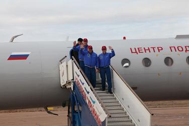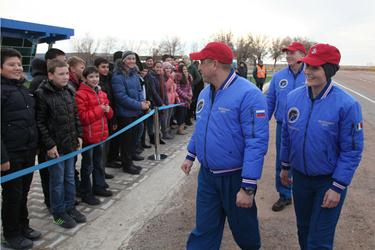 В аэропорту «Крайний» членов основного экипажа - российского космонавта Антона Шкаплерова, астронавта ЕКА Саманту Кристофоретти, астронавта НАСА Терри Вёртс приветствовали исполняющий обязанности Главы администрации г.Байконур Анатолий Петренко, представители Управления Роскосмоса на космодроме Байконур, УМВД России на комплексе «Байконур», РКК «Энергия», а так же учащиеся Международной космической школы. Из аэропорта экипаж проследовал в город.