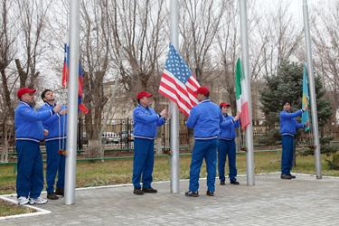 Члены основного экипажа Антон Шкаплеров, Саманта Кристоферетти и Терри Вёрст, дублеры Олег Кононенко, Кимия Юи и Челл Линдгрен подняли флаги России, США, Италии и Казахстана.