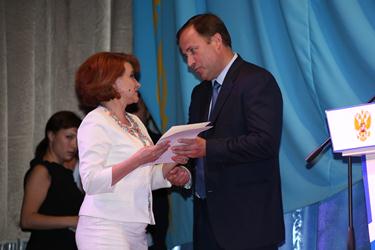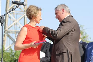 В торжественной обстановке Дмитрий Рогозин вручил директору музея космодрома Байконур филиала ФГУП "ЦЭНКИ - "Космический центр "Южный" Антонине Богдановой государственную награду - орден Дружбы.