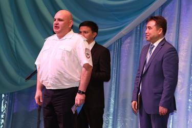 Он представил военно-патриотический клуб «Космодром», который на протяжении многих лет является победителем многочисленных юнармейских сборов и слетов, и воспитанника детско-юношеской спортивной школы Куанышбая Тулегенова, завоевавшего в мае 2015 года титул Чемпиона мира по пауэрлифтингу.