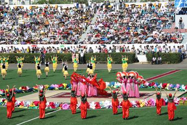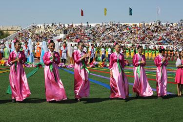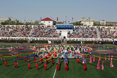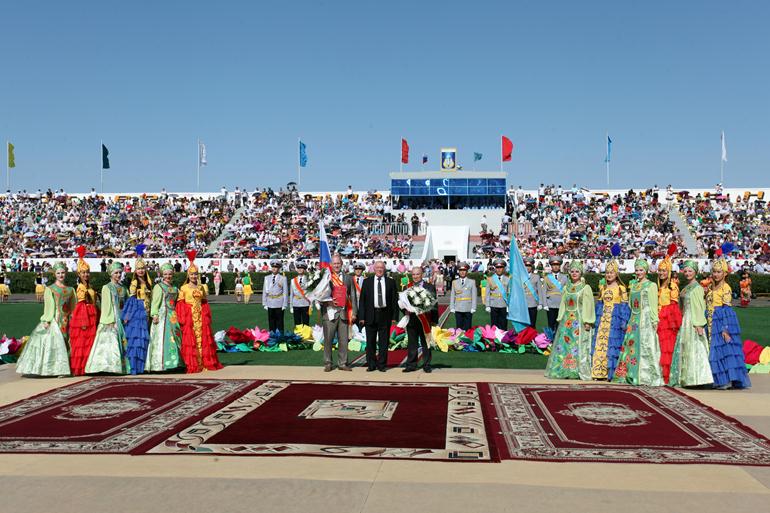 Праздничную программу на стадионе продолжила красочная хореографическая композиция «Венок дружбы Байконура» с участием многочисленных творческих коллективов и школьников города. Творческие коллективы исполнили танцы народов некогда единой державы – Советского Союза. После завершения красочной композиции, подготовленной под руководством городского Дворца культуры, Анатолий Петренко выразил благодарность детям и их наставникам за подарок Байконуру. «Я всегда подчеркивал и повторю снова: дети Байконура – лучшие! Сегодня вы вновь подтвердили это. В присутствии высоких гостей я хочу отметить, что байконурская молодежь прославляет наш замечательный город далеко за пределами космической гавани»,- отметил руководитель городской администрации.