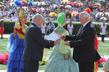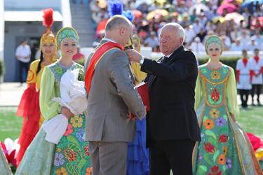 Составной частью торжества стала церемония присвоения звания «Почетный гражданин города Байконур», которым в юбилейном году было удостоено 4 человека. Анатолий Петренко вручил атрибуты почетного звания космонавту-испытателю отряда ЦПК им. Ю.Гагарина, выпускнику средней школы № 211 города Ленинска Артемьеву Олегу Германовичу и начальнику совместного расчета подготовки и пуска РКН ФГУП «ЦЭНКИ» - Космический центр «Южный» Инголенко Владимиру Дмитриевичу.