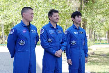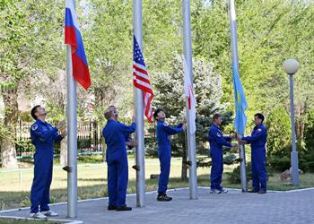 Члены основного экипажа Олег Кононенко, Кимия Юи и Челл Линдгрен, дублеры Юрий Маленченко, Тимоти Копра и Тимоти Пик подняли флаги России, США, Японии и Казахстана.