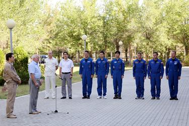 Обращаясь к членам экипажей, исполняющий обязанности Главы администрации города Байконур Анатолий Петренко, начальник Управления Роскосмоса на комплексе «Байконур» Анатолий Белоконь и руководитель Управления космодрома «Байконур» Аэрокосмического комитета Министерства по инвестициям и развитию Республики Казахстан Галымжан Данбаев пожелали им успешного полёта и плодотворной работы на МКС.