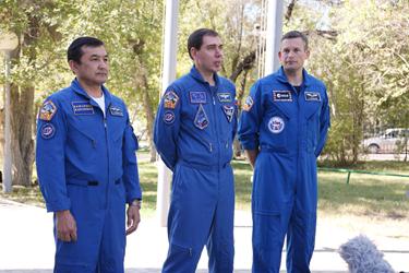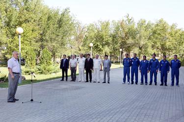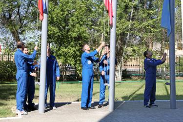 Члены основного экипажа транспортного пилотируемого корабля "Союз ТМА-18М" – космонавт Роскосмоса Сергей Волков, астронавт ЕКА Андреас Могенсен и космонавт Казкосмоса Айдын Аимбетов, их дублеры российские космонавты Олег Скрипочка, Сергей Прокопьев и астронавт ЕКА Тома Песке подняли флаги России, Дании и Казахстана.