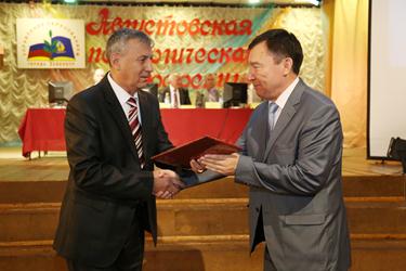 Открыл конференцию Глава городской администрации Анатолий Петренко. В своем выступлении он отметил, что школа – это центр образовательной, культурной и общественной жизни детей. И сегодня она выполняет важную функцию объединения людей ради общей цели – образования молодого поколения. Анатолий Петренко подчеркнул, что в этом году общие результаты единого государственного экзамена в городе не ниже средних всероссийских результатов. По итогам государственной итоговой аттестации из 420 выпускников 6 человек (выпускницы ГБОУ СШ №1, №3, №4, №7, ГБОУ Лицей МКШ) получили аттестат с отличием и медаль «За особые успехи в учении», знак «Алтын белги» и аттестат с «отличием» у выпускниц ГБОУ СШ №5.