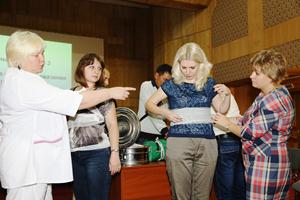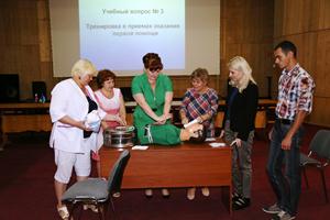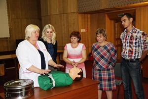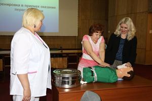 В практической части занятия сотрудникам администрации была предоставлена возможность потренироваться на манекене в приемах оказания первой помощи при различных неотложных состояниях. В ходе учебного занятия был продемонстрирован тематический фильм.