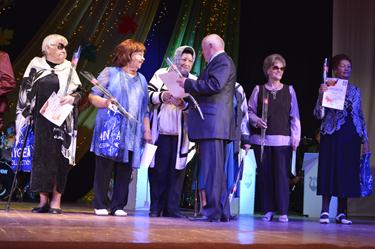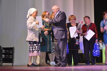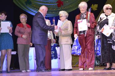 Торжественную часть Дня пожилых людей открыл Глава городской администрации Анатолий Петренко. Он отметил, что в зале собрались люди, принадлежащие к поколению много повидавшему и пережившему. За плечами старшего поколения байконурцев победа в Великой Отечественной войне, 70-летие которой отмечалось в этом году, строительство и развитие Байконура, которому 2 июня исполнилось 60 лет, многолетний самоотверженный труд на благо Отечества, ради будущего потомков. «Отрадно, что наши ветераны приняли активное участие в этих знаменательных событиях и щедро делились с молодежью воспоминаниями о трудных военных годах и созидательном труде в годы строительства и развития космической гавани. Я уверен, что молодому поколению нужны ваши знания, опыт, мудрость и просто совет. В ваших добрых и сильных сердцах черпает молодежь поддержку и понимание, терпение и любовь, энергию и вдохновение, а главное – веру», - подчеркнул Анатолий Петренко. Он поздравил ветеранов с праздником и пожелал им крепкого здоровья, благополучия, долгих лет жизни и оптимизма. Участницам выставки рукоделия были вручены грамоты и памятные подарки.