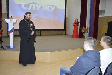 Со словами напутствия к молодым людям обратились военный комиссар города Байконур Николай Придворов, военный прокурор города Байконур Наиль Уразгельдиев, священник православного храма святого Георгия Победоносца протоирей отец Михаил, представители региональных отделений общероссийских общественных организаций «Офицеры России» и «Боевое братство».