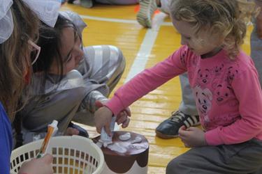 После проведения зарядки ребята распределились по командам – «космическим экипажам» и преступили к снаряжению «ракетоносителей». Для этого им необходимо было наклеить на корпус ракеты разноцветные звезды и отправиться на ней в импровизированное космическое путешествие. Каждая эстафета соревнований была одним из фантастических приключений. Участникам пришлось «отбиваться» от атаки космических пиратов, доставлять специальный груз на Оранжевую планету, уворачиваться от метеоритного дождя и даже украшать настоящий космический торт при помощи «специальных продуктов питания космонавтов» - тюбиков с зубной пастой. Удалось побывать и на удивительной планете «Карате», обитатели которой – воспитанники детско-юношеской спортивной школы, показали впечатляющее выступление, вызвав бурю эмоций у всех зрителей. Но наиболее увлекательным и особенно трогательным был конкурс, в котором ребятам представилась возможность самим открыть свою собственную планету, разукрасить её и придумать ей название. Под умелым руководством волонтеров, дети не жалели красок для того, чтобы с помощью этого нехитрого занятия, передать все свое настроение и переполняющие их чувства. Ярким впечатлением праздника было путешествие на планету Звездочетов. Все гости смогли увидеть фантастическое представление из мыльных пузырей, которые, по словам звездочетов, улетая, превращались в маленькие, но очень яркие звезды.