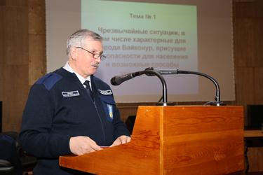 Занятия проводил начальник отдела по чрезвычайным ситуациям Александр Красюков. В своем выступлении он осветил понятия о ЧС природного и техногенного характера, в том числе характерные для города Байконур, способы защиты населения от них, права и обязанности граждан Российской Федерации в области защиты от ЧС, а также ответственность за нарушение требований нормативных правовых актов в области защиты от ЧС. В ходе занятий был продемонстрирован тематический фильм.