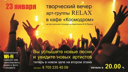 23 января в большом зале кафе "Космодром" состоится концерт самодеятельной арт-группы "РЕЛАКС" (руководитель Александр Александров). В репертуаре группы - композиции различных стилей (русский рок, рок-н-ролл, блюз, джаз, поп-музыка), песни из репертуара Виктора Цоя, Елены Ваенга, Земфиры, рок-групп "Воскресенье" и "Машины времени".