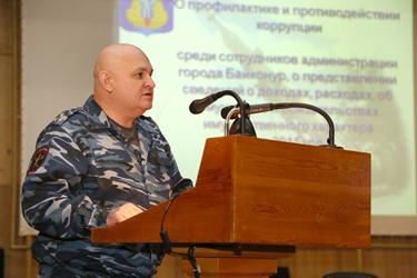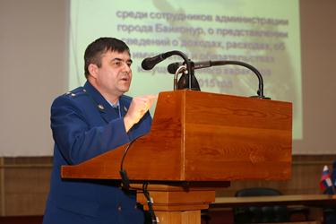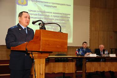 Заместитель прокурора комплекса «Байконур» Николай Балацкий выступил с обзором результатов работы прокуратуры по профилактике и противодействию коррупции. В своем докладе он отметил коррупционные нарушения, имеющиеся на предприятиях города, а также указал на факты осуждения должностных лиц за совершение коррупционных преступлений. Старший помощник прокурора комплекса «Байконур» Олег Ким осветил в своем выступлении требования законодательства Российской Федерации, регламентирующие порядок предоставления муниципальными служащими сведений о доходах, расходах, об имуществе и обязательствах имущественного характера. Он дал практические советы по правилам заполнения отчетных документов, налоговых и имущественных деклараций. Прокурор комплекса «Байконур» Александр Трифонов рассказал о деятельности прокуратуры в области противодействия коррупции и отметил, что проверка и расследование коррупционных правонарушений и преступлений, совершенных гражданами, будет ставиться на особый контроль.