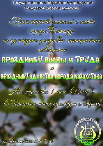 12.00. Праздничная концертная программа, посвященная празднику Весны и Труда и Дню единства народов Казахстана.