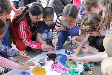 Студенты Байконурского электрорадиотехнического техникума провели творческое занятие для детей с ограниченными возможностями здоровья, результатом которого стал коллаж, изготовленный из цветной бумаги и пальчиковых красок под названием «Бескрайний космос».