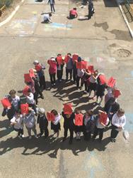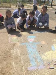 В ходе проведения акции ученики 2-ых классов начальной школы №12 на асфальте во дворе учебного заведения рисовали тематические рисунки. В завершение мероприятия школьники выстроили композицию в виде знака «Дети».
