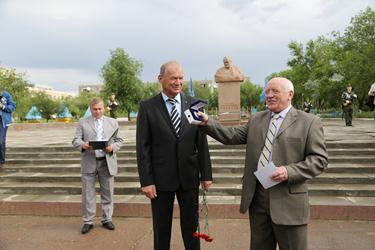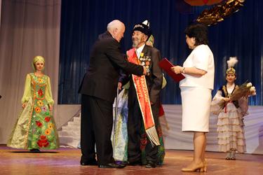 Затем на сцену под громкие аплодисменты поднялся ветеран Великой Отечественной войны Калмырза Жарманов, которому Анатолий Петренко вручил атрибуты звания «Почетный гражданин города Байконур».