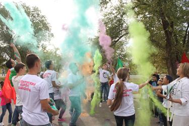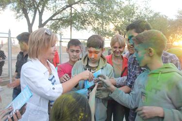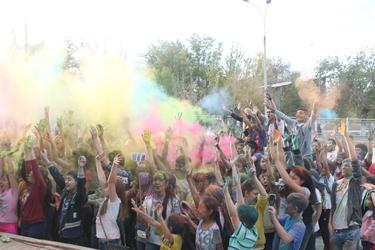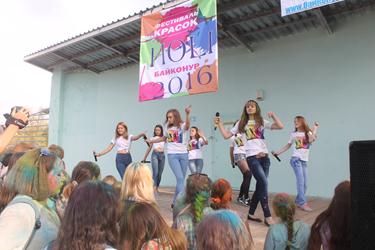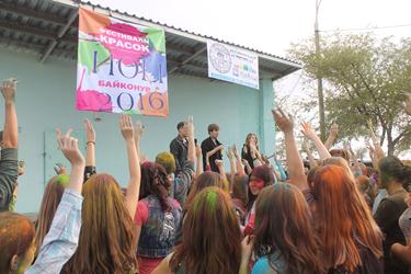 В Байконуре это «цветное безумие» проходит уже в третий раз в этом году. Праздник красок холи начался с выступления Розы Рзаевой - солистки Городского Дворца культуры, обладательницы титула «Золотой голос Байконура» - с песней «Lean on» и, конечно же, с инструктажа по применению красок. В этот вечер, помимо возможности обсыпать друг друга яркими красками, участники и гости праздника смогли насладиться зажигательными музыкальными номерами солистов Дворца культуры: Мадина Каиржанова и Анастасия Ким исполнили известную среди молодежи песню «Потеряла голову», Айгуль Тажимбетова выступила с зажигательными песнями «Haide Hopа» и «Bang bang», Александра Жеребцова представила публике популярные песни в жанре рок-н-ролл – «I love rock’n’roll», «We will rock you», а Нурдаулет Досжанов и Роза Рзаева исполнили дуэтом новые песни «Экзамен» и «Часть тебя». Также в этот вечер для молодежи прозвучали песни в исполнении Надежды Гордеевой: «Только ты», Филипа Жунку - «Тиха, соня», «Где ты, где я», студенческий дуэт Филипа Жунку и Татьяны Рудкаст - «Кислород». Порадовали участников и гостей фестиваля своими музыкальными номерами и воспитанники Центра развития творчества детей и юношества. Вокалистам с удовольствием подпевали все участники фестиваля.