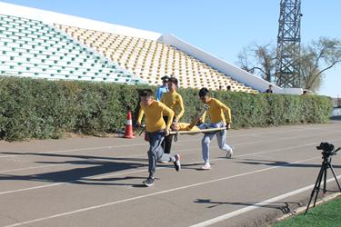 В детской пожарно‑технической эстафете принимали участие 99 учащихся общеобразовательных организаций города Байконур. Каждая образовательная организация выставила 1 команду в составе 9 участников (8 человек + 1 запасной). Эстафета состояла из пяти этапов: