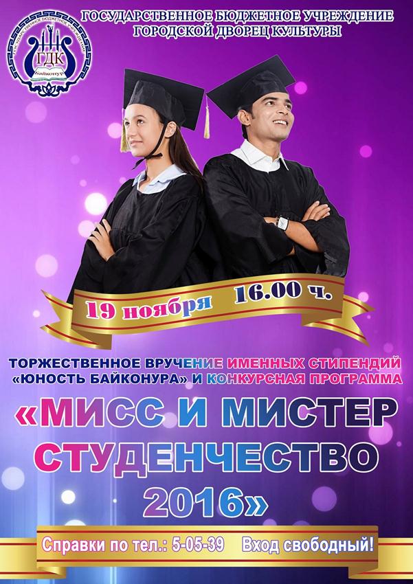 17.11.2016 - 19.11.2016  Торжественное вручение именных стипендий "Юность Байконура" и конкурная программа "Мисс и Мистер студенчество 2016"