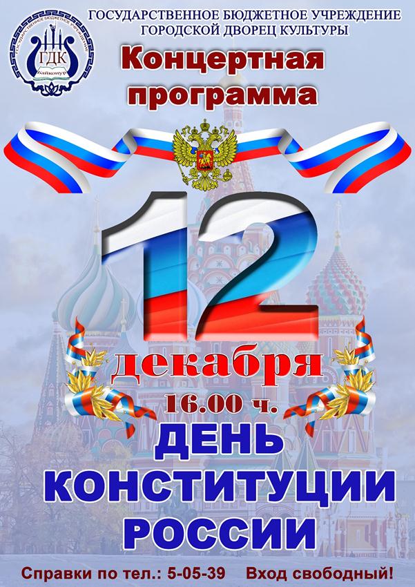 16.00. ГДК (большой зал). Торжественное собрание и концертная программа, посвященные Дню Конституции Российской Федерации.