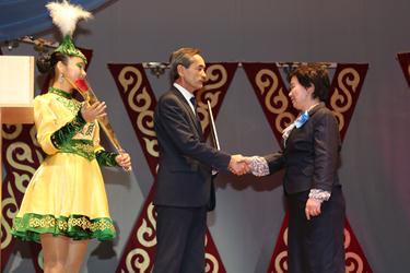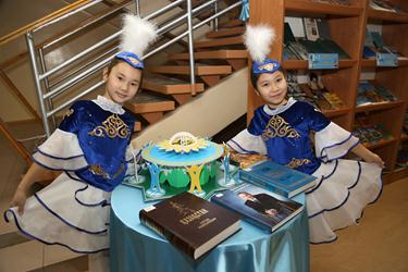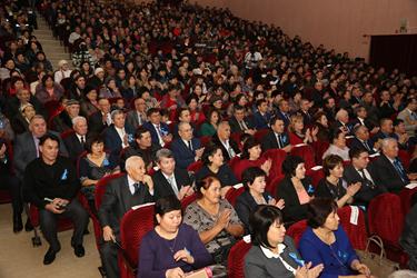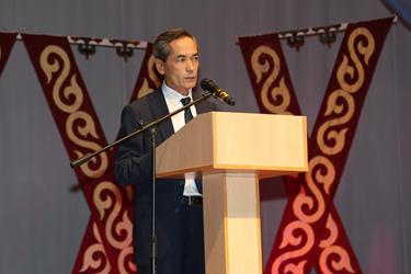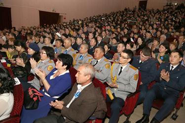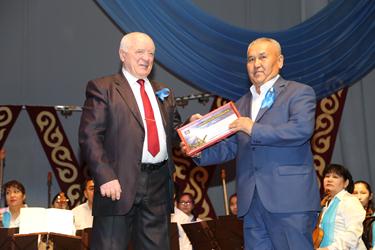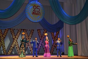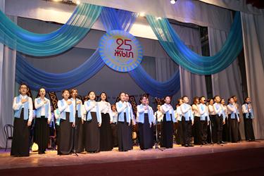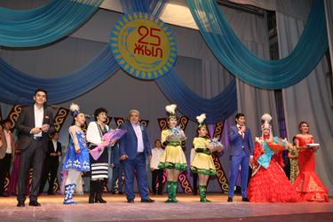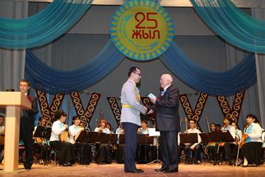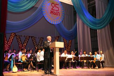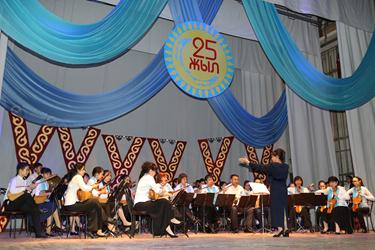 Официальная часть торжества началась с гимна Республики Казахстан в исполнении участников сводного оркестра народных инструментов, педагогов детских музыкальных школ города и солистов ГДК.
