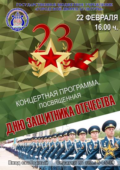 16.00. ГДК (большой зал). Торжественное собрание и праздничный концерт, посвященные Дню защитника Отечества.