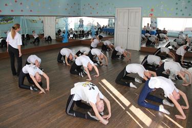 Опытный педагог Людмила Новикова и Елена Антипова, руководители образцового ансамбля эстрадного танца «Променад», показали на занятиях с детьми младшей группы силовые упражнения в современной хореографии и развивали чувство ритма у детей средней группы.
