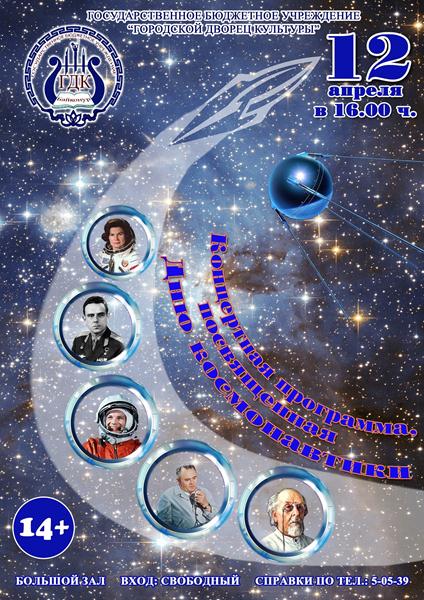 16.00. ГДК (большой зал). Торжественное собрание и концертная программа, посвященные Дню космонавтики.