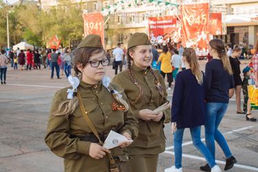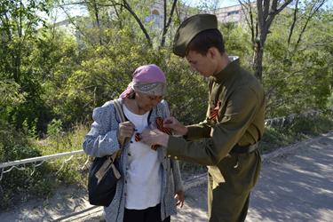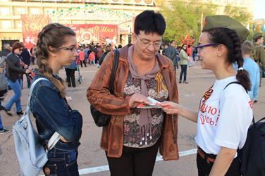 9 мая георгиевские ленты вручались в сквере Победы участникам торжественного митинга, посвященного 72-й годовщине Победы советского народа в Великой Отечественной войне, и участникам мемориального шествия «Бессмертный полк Байконура».