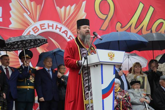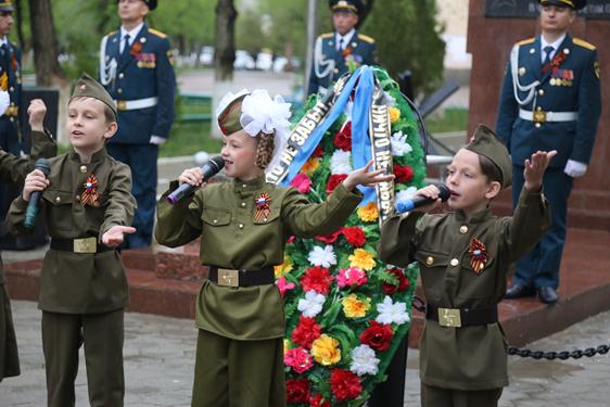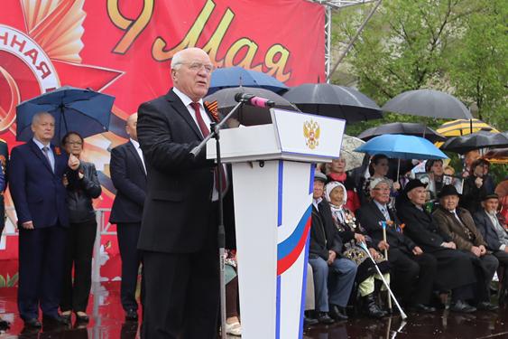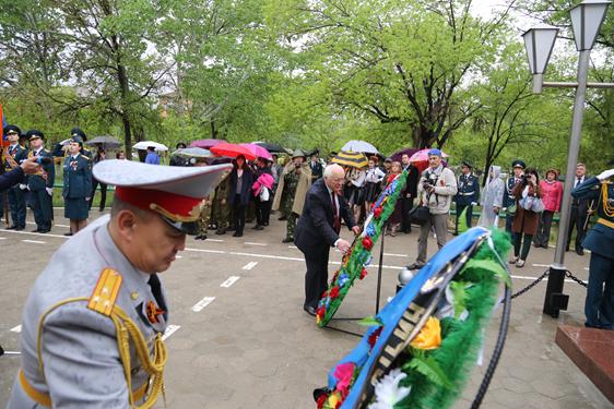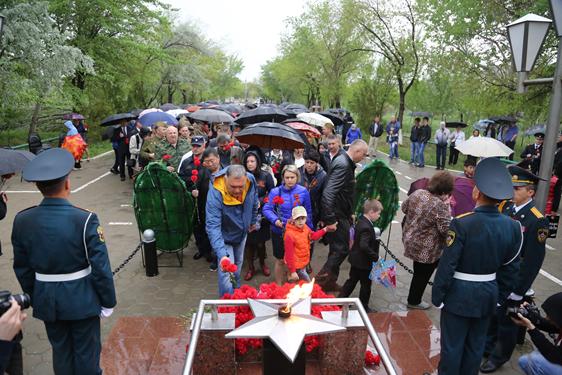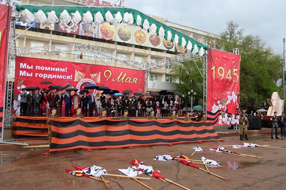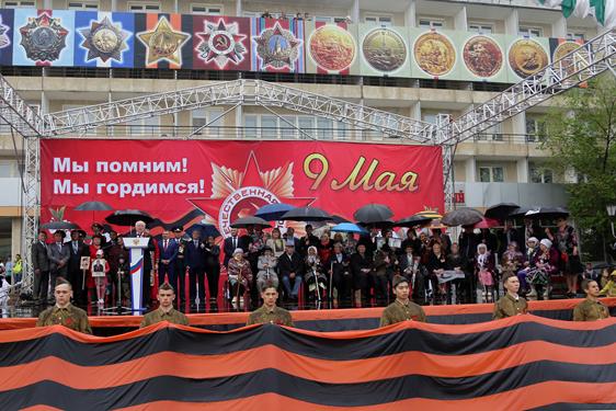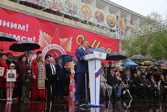 С главной сцены, установленной на центральной площади, байконурцев с Днем Победы поздравил Глава города Анатолий Петренко. В своей речи он отметил, что в каждой семье бережно хранится память о родных, сражавшихся на фронтах войны и ковавших Победу в тылу. «Свет этой Победы не померкнет никогда, и будет освещать историю не только Советского Союза, но всех стран и народов, противостоявших фашизму. Мы всегда будем помнить, что фронтовики построили наш город и космодром, дети фронтовиков создавали и укрепляли ракетный щит страны, внуки и правнуки победителей продолжают направлять в космос космические корабли. И в этом тоже великое значение Победы 1945 года», - подчеркнул в своей речи А.Петренко.