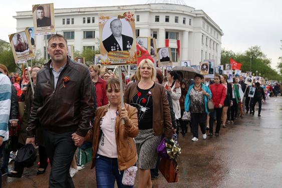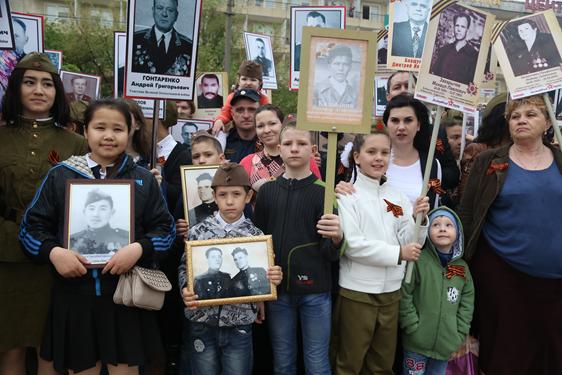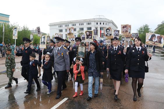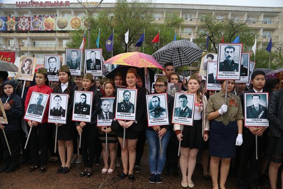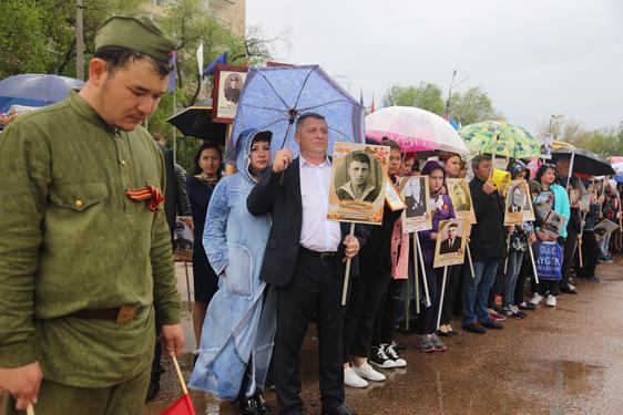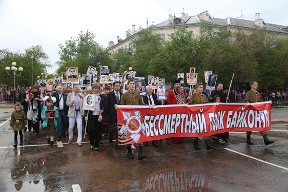 Центральным событием празднования Дня Победы стало шествие «Бессмертный полк Байконура», главная задача которого - сохранение в каждой семье памяти о солдатах Великой Отечественной войны. Участники шествия несли планшеты с фотографиями фронтовиков, родных и близких военного поколения. Возглавил шествие Глава администрации города Байконур Анатолий Петренко, который нес фотографии деда и двух дядей. Колонна «Бессмертный полк Байконура» стартовала от православного храма на улице Максимова, прошла по проспекту Абая, пешеходной зоне проспекта Королева и финишировала на площади имени Ленина, где участников шествия приветствовали горожане. В шествии приняли участие около 1500 человек.