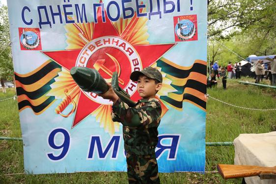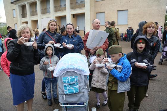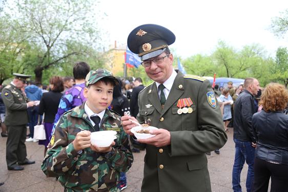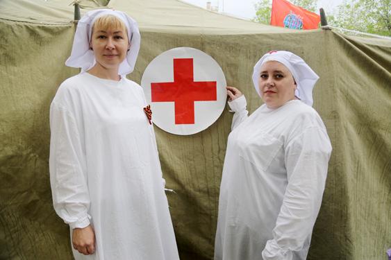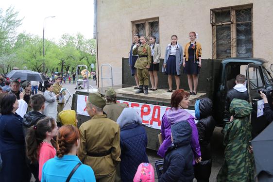 Затем эпицентр праздника переместился в сквер Победы. Члены общественной организации «Офицеры России» совместно с Управлением культуры, молодежной политики, туризма и спорта и организацией «Боевое братство» развернули в сквере военно-историческую экспозицию, посвященную Великой Отечественной войне. В экспозицию были включены элементы оборудования военного быта - стрелковые ячейки для автоматчиков и пулеметчика, командирский блиндаж с узлом связи, пункты питания солдат и приема раненых, лазарет с операционной и т.д. Члены ветеранской организации, одетые в военную форму времен войны, демонстрировали макеты оружия. Жители города и гости имели возможность сфотографироваться с оружием и в военной форме, отведать «фронтовой» каши полевой кухни.