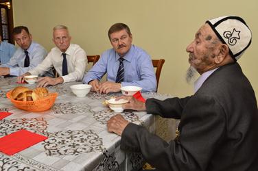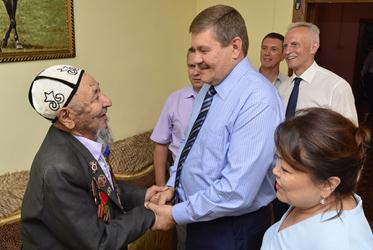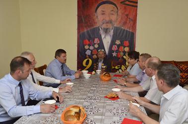 Затем гостей пригласили за стол, угостили традиционными казахскими напитками - шубатом и кумысом (кисломолочные напитки из верблюжьего и кобыльего молока). Увидев на стене баннер с фотографией ветерана, Константин Бусыгин дал поручение изготовить баннеры с фотографиями Калмурзы Жарманова и Анны Халезовой и разместить их в городе. Он отметил, что сохранить память о ветеранах войны – наш священный долг.