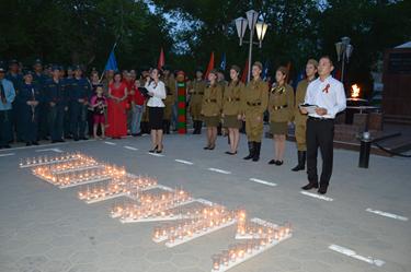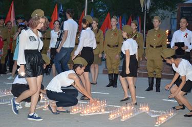 Студенты поставили у надписи «ПОМНИМ», выложенной на асфальте, зажженные свечи. Мерцающие в темноте огоньки - дань памяти байконурцев тем, кто 76 лет назад встретил летний рассвет под грохот вражеских бомб, кто погиб на войне.