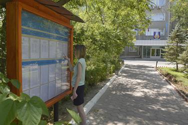 Для наиболее полного удовлетворения информационных потребностей жителей города, у здания администрации города Байконура (на проспекте Королева, 33) установлен стенд с информацией о городском жилищном фонде.
