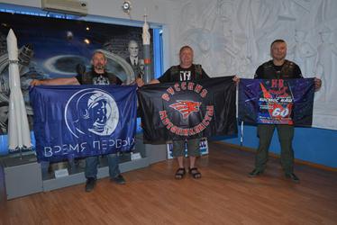 В Новосибирске байкерам вручили флаг «Русские мотоциклисты», который побывал в космосе, чтобы они привезли его на родину космонавтики. Кроме того, участники мотопробега везут с собой флаги «Ночных волков», а также флаг «Время первых», который им вручил лётчик-космонавт Алексей Леонов, давший напутствие участникам мотопробега. Виталий Падалкин и отец Сергий также обменялись сувенирными знаками.