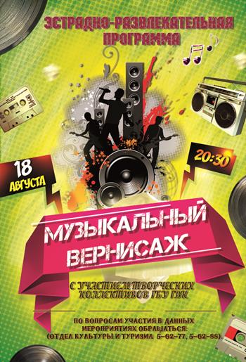18 августа в 20 часов 30 минут на площади имени Ленина состоится эстрадно-развлекательный концерт «Музыкальный вернисаж» с участием солистов Городского Дворцы культуры.
