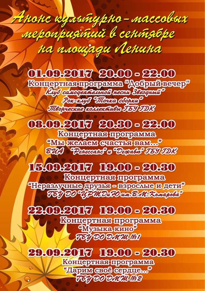 Все желающие раскрыть свои творческие способности могут принять участие в культурно-массовых мероприятиях (конкурсах, викторинах, игровых развлекательных и концертных программах) в каждую пятницу в сентябре 2017 года на площади им.Ленина.