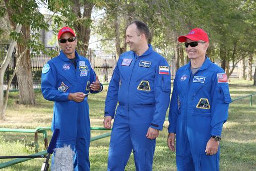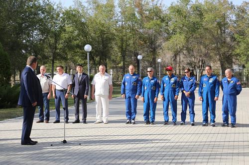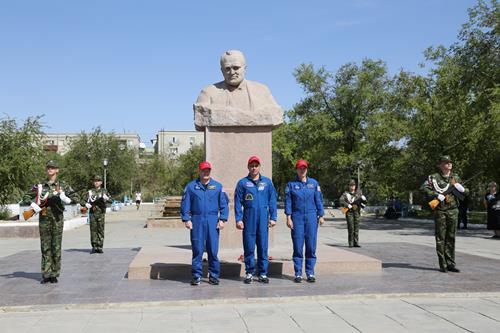 В сквере имени Юрия Гагарина экипаж приветствовали глава администрации города Байконур Константин Бусыгин, руководители и сотрудники подразделений администрации, учащиеся общеобразовательных школ города. К.Бусыгин вручил астронавту Скотту Тинглу серебряный памятный знак «Байконур», впервые посетившему космодром в составе дублирующего экипажа. Антон Шкаплеров и Шеннон Уокер уже имеют в своем багаже по одному космическому полету. Дублеры возложили цветы к памятнику Юрию Гагарину. Учащиеся Международной космической школы в честь гостей салютовали залпом моделей ракет, которые они изготовили своими руками.