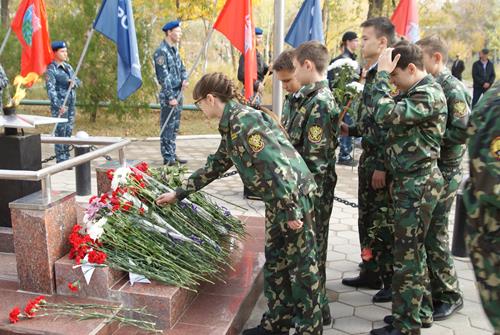 Завершился митинг возложением цветов к памятнику Победы, у которого несли вахту члены добровольного студенческого спасательного отряда «Вымпел» байконурского электрорадиотехнического техникума им.Неделина.