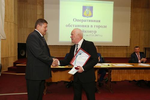 В начале заседания Константин Бусыгин поздравил с юбилеем главного специалиста организационного отдела Управления социальной защиты населения Виктора Кулепетова, которому 19 ноября исполнилось 70 лет. Виктор Кулепетов приехал с родителями на Байконур в 1957 году. После окончания военного училища в г.Харькове, где он получил специальность инженера-испытателя, более 30-лет служил на космодроме Байконур, работал в информационно-вычислительном центре, участвовал во многих пилотируемых программах, а также в лунной программе и масштабных проектах «Союз-Апполон» и «Энергия-Буран». После окончания военной службы Виктор Николаевич Кулепетов продолжил свою работу в Управлении социальной защиты населения. Вскоре он планирует завершить трудовую деятельность. Глава города вручил юбиляру серебряный памятный знак «Байконур» и благодарственное письмо, пожелал ему долгих лет жизни и всего самого наилучшего.