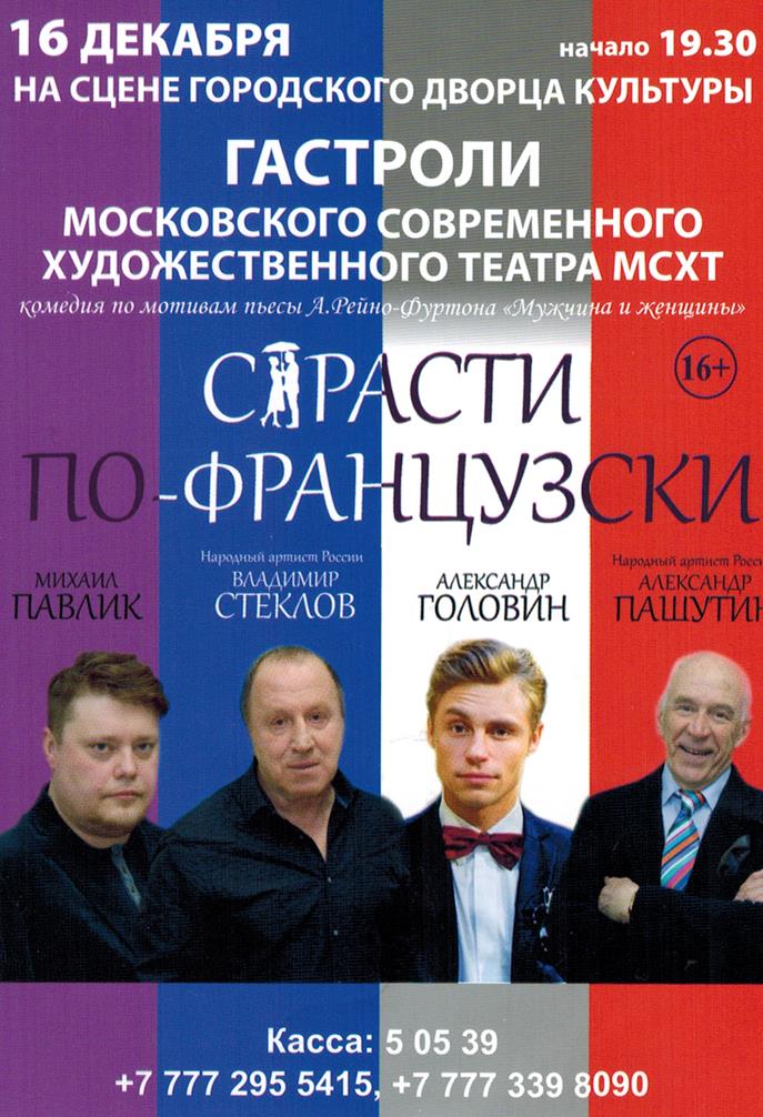 16 декабря 2017 года в 19:30 часов в большом зале ГБУ "Городской дворец культуры" состоятся гастроли Московского современного художественного театра "МСХТ" с комедийным спектаклем "Страсти по-французски" с участием Народного артиста России Владимира Стеклова, Александра Головина и других актеров театра и кино "МСХТ".
