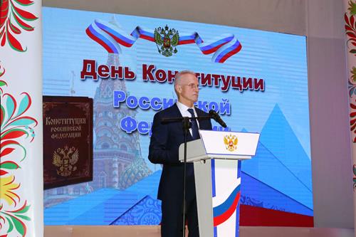В начале торжественного собрания прозвучал государственный гимн Российской Федерации. Официальную часть торжества открыл и.о. главы администрации города Байконур Виктор Лопаткин. Поздравив байконурцев с праздником, он отметил, что принятая 12 декабря 1993 года на всенародном референдуме Конституция Российской Федерации закрепила изменения, произошедшие в стране, положила начало стабилизации новых государственных и экономических структур, а также провозгласила основные права и свободы человека и гражданина. Время доказало, что Конституция России - это надежная основа для крепкой государственности, конкурентоспособной экономики, прочный фундамент для проведения грамотной социальной политики, повышения благосостояния россиян.